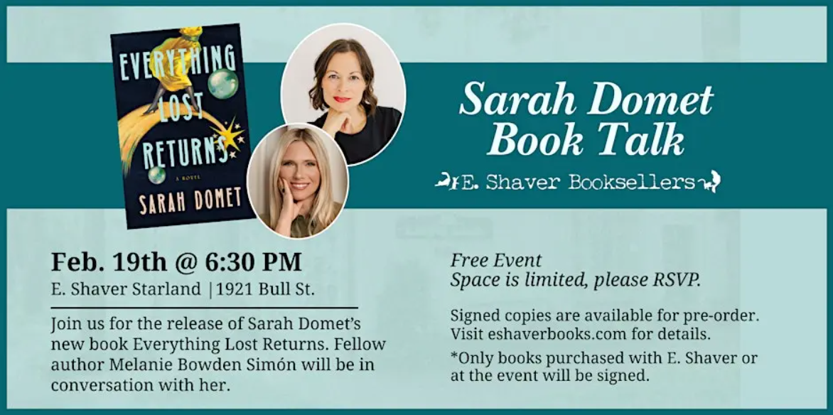 Join us for the release of Sarah Domet’s new book Everything Lost Returns. Fellow author Melanie Bowden Simón will be in conversation.